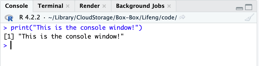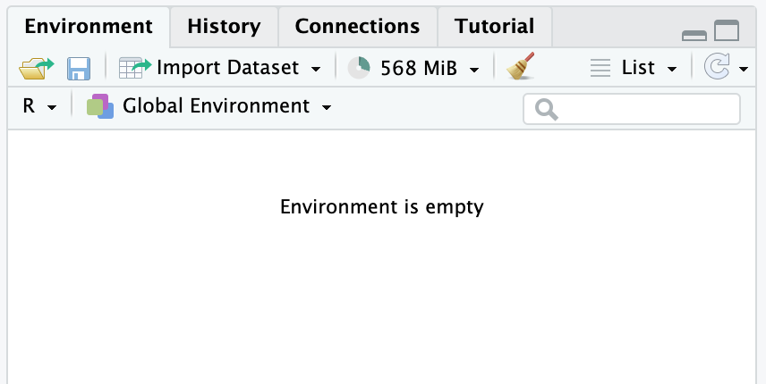 window: Right now it is empty, because we have not loaded any data yet. Here is the place, we can see some data frames, functions, and vectors.