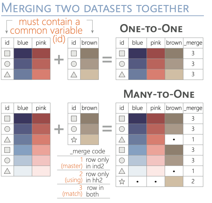 : Many-to-one join: You start with the “one” dataset. For each unique identifier in the “one” dataset, there are multiple corresponding observations in the “many” dataset. When you perform the merge, the single observation in the “one” dataset gets matched to each of the multiple observations in the “many” dataset with the same identifier.