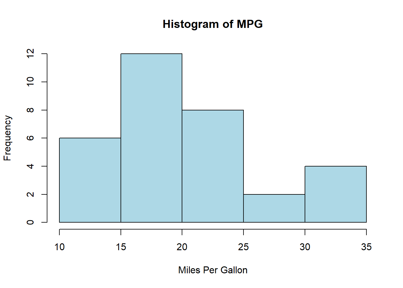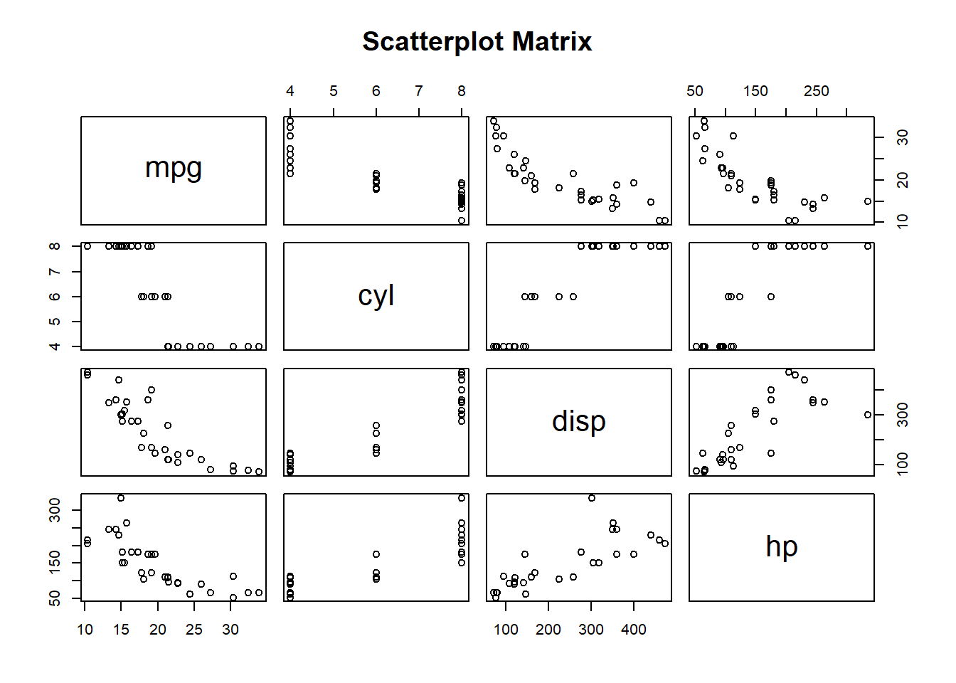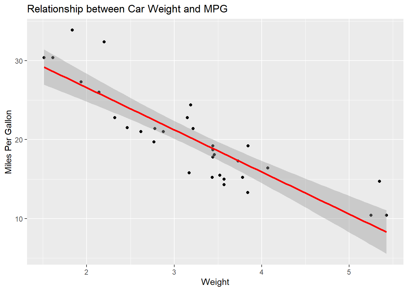 using a scatter plot.plot(merged_data_base$wt, merged_data_base$mpg, ...)